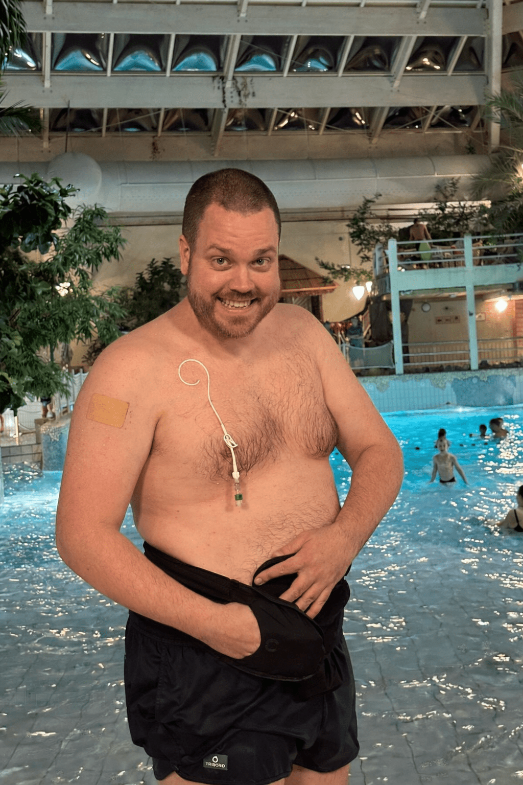 In die periode begon ik met TPV-voeding via een Hickman-infuuslijn. En ja… het idee om daarmee het zwembad in te gaan voelde behoorlijk spannend. Het werd mij wel verteld dat het zou moeten kunnen. Maar ik heb het een lange tijd afgehouden. Toch begon het steeds meer te kriebelen. Want eerlijk is eerlijk: ik weet inmiddels uit ervaring dat zwemmen met een stomazakje eigenlijk verrassend goed gaat.